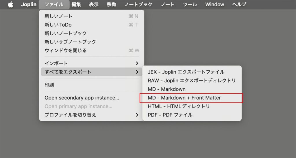 Joplinの[ファイル]メニュー → [すべてをエクスポート]→[MD – MarkDown + Font Matter]をクリックするだけ。
