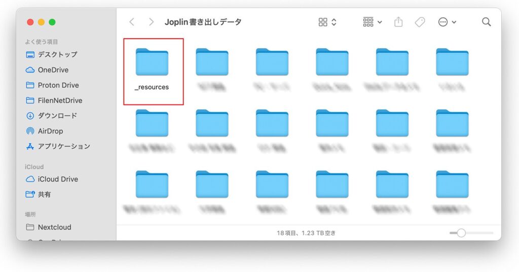 保存した場所を開くとデータフォルダが並んでいますが、[ _resources ]のフォルダ名のアンダーバーを消して[ resources ]としておきます。アンダーバーがあるとObsidianで正しく読み込めないケースが多いようです。