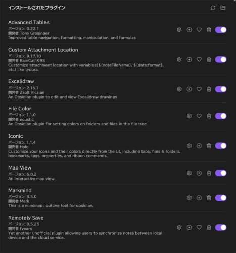 知人から共有されて勝手に入ったものも含めて以下のプラグインを使っています。ちなみに公式の有料の同期機能は使っていないのでコアプラグインの[同期]は無効にしています。