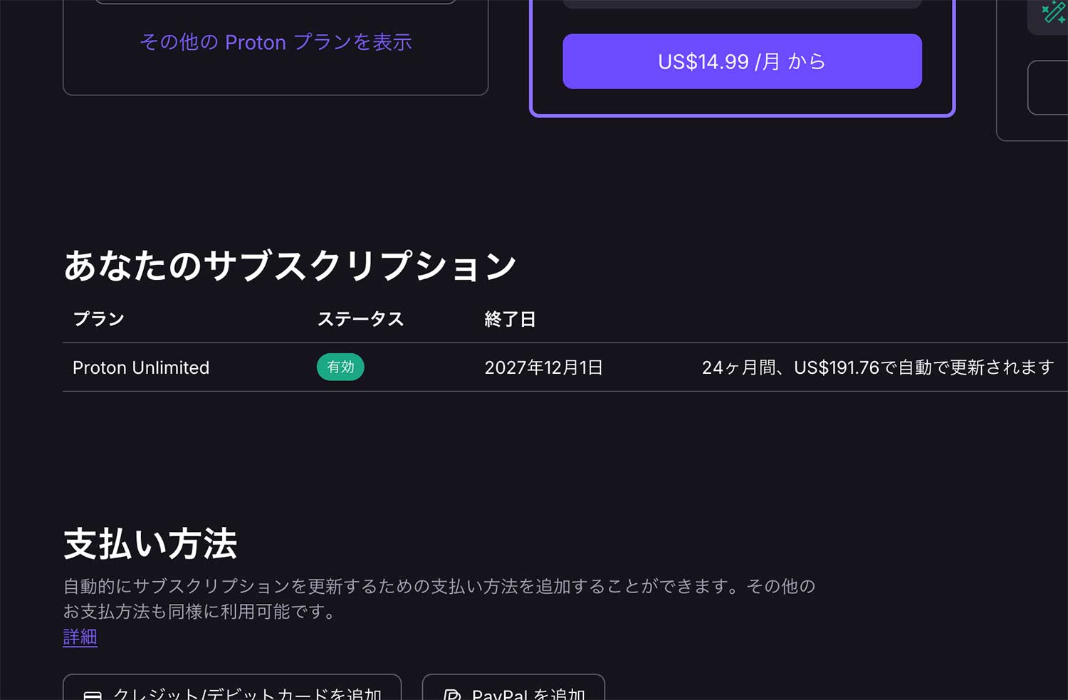 ProtonのUnlimitedプランのサブスクを、2年間更新しました。